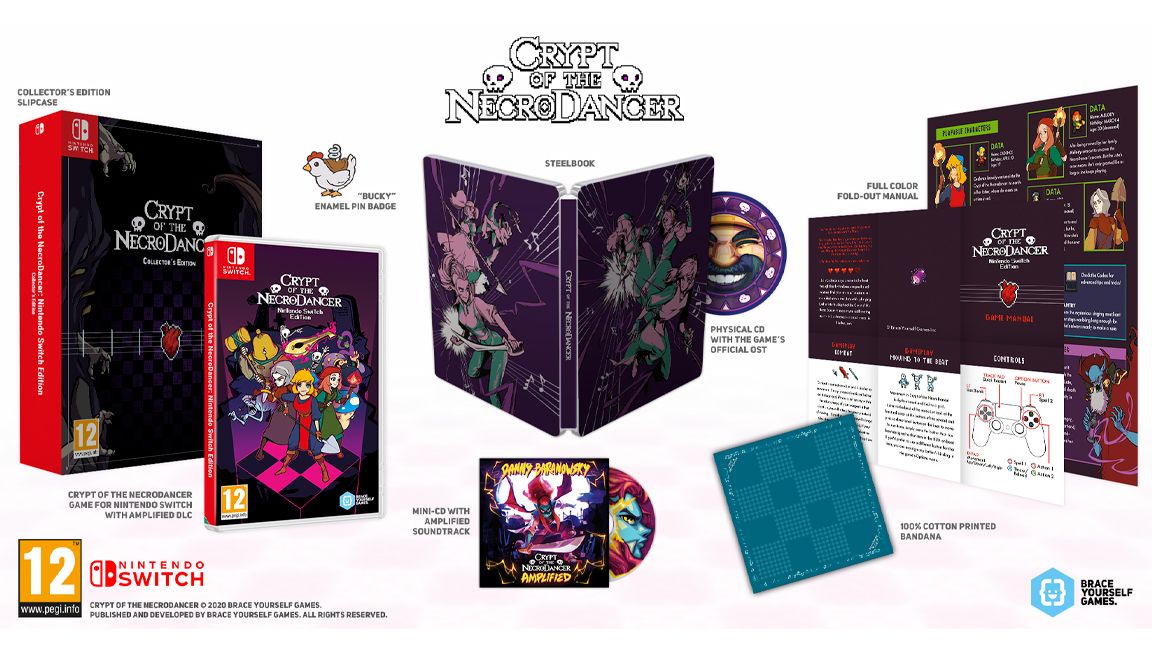 Featuring an illustrated steelbook case with a full-color manual, exclusive 100% cotton printed “Cadence” bandana, and enamel pin of “Bucky”, an unused pet familiar by original NecroDancer artist, Jesse Turner.