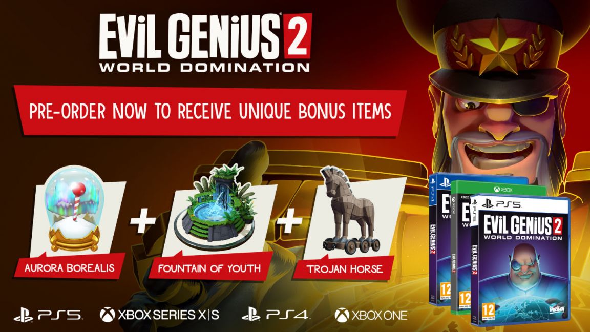 Order Evil Genius 2: World Domination and receive unique bonus items: Aurora Borealis, Fountain of Youth, and Trojan Horse!