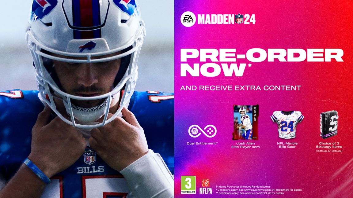 Pre-order the Standard Edition and receive: Josh Allen Elite Player Item, Choice of 2 Strategy Items (1 Offense & 1 Defense), NFL Marble Bills Gear, Dual Entitlement (PlayStation & Xbox - see EA for terms and conditions)