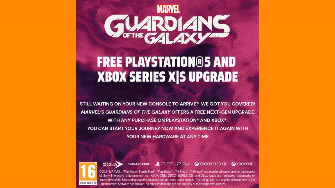 Still waiting on your new console to arrive? We got you covered! Marvel's Guardians of the Galaxy offers a free next-gen upgrade with any purchase on Playstation and Xbox. You can start your journey now and experience it again with your new hardware at any time.